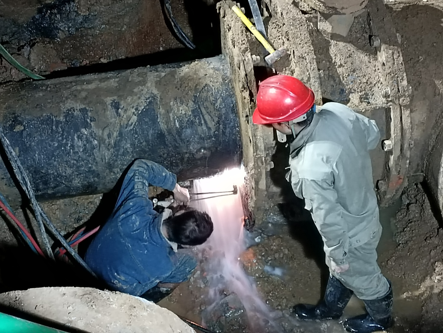 晚上10点,更换工作正式开始,关闸止水、排空积水、拆除旧蝶阀、安装新蝶阀,流程看似简单,但每道工序都有严格的操作规程,需要现场每个人的付出和配合。时值倒春寒天气,现场寒风阵阵,工作坑内更是寒气逼人,但维修人员全然不顾,抢时间,争速度,分工协作,轮流上阵,连续作战。