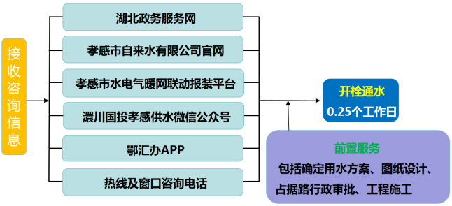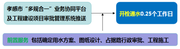 流程说明:供水企业通过孝感市“多规合一”业务协同平台及工程建设项目审批管理系统推送获取项目建设信息后主动对接,先行开展确定用水方案、图纸设计、工程施工等服务,办理用水工程涉及的占道、掘路、占用绿地、伐移树木等相关行政审批手续,提前完成外线工程实施,为客户提供“无感免申请”服务。客户需要用水时,0.25个工作日内开栓通水。