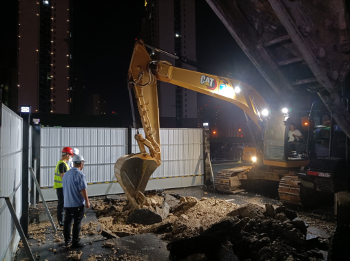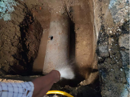 在快速挖开路面找出供水主管道后,经技术人员现场分析判断,确定此次DN600供水主管道被施工损坏是因孝武大道道路改造施工导致,其施工人员操作啄木鸟时不慎将水泥供水管道挖破。随后技术人员迅速制定了维修方案,即采用DN800钢管抱箍,快速水泥填充的方式修复。为缩减抢修时间,运行维护部共派出各类工程车辆5辆,抢修人员18名参与到此次抢修任务中。尽管已到深夜,气温仍接近30摄氏度,但抢修人员不顾疲劳和炎热,抢时间、赶进度,通宵作战,终于在11日早上6点完成抢修任务,顺利通水。