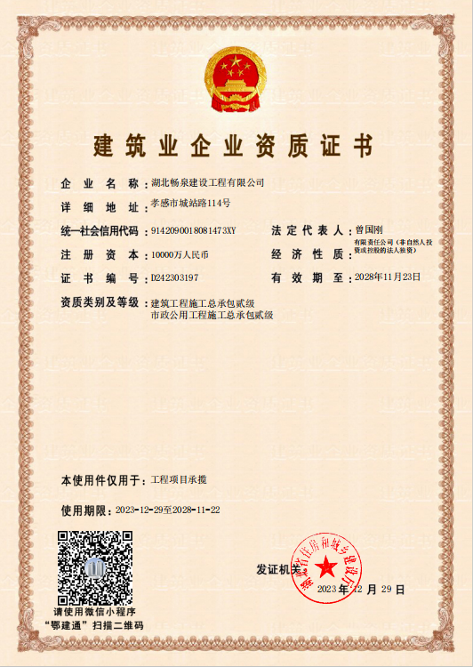 畅泉公司喜获“市政公用工程施工总承包贰级”资质