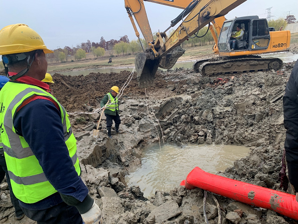 孝感城区向云梦供水的DN1200主管道于2013年建成通水,是供给云梦县城乡生产生活用水的唯一通道。由于爆管位置恰处于澴河主河道中央,尽管枯水季水位不高,但管道口径大、埋深大,现场抢修仍面临极大的困难。预案启动后,市住房和城市更新局、澴川国投集团和公司相关负责人第一时间赶到现场调度指挥,会同技术人员现场研判分析,迅速制定了抢修方案。