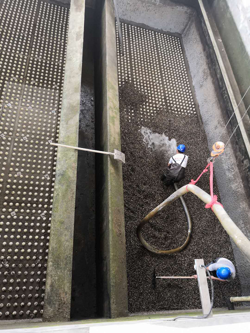 为了确保市民用上更加洁净、优质的自来水,近日,公司对三水厂12格V型滤池石英砂滤料进行全部更换。