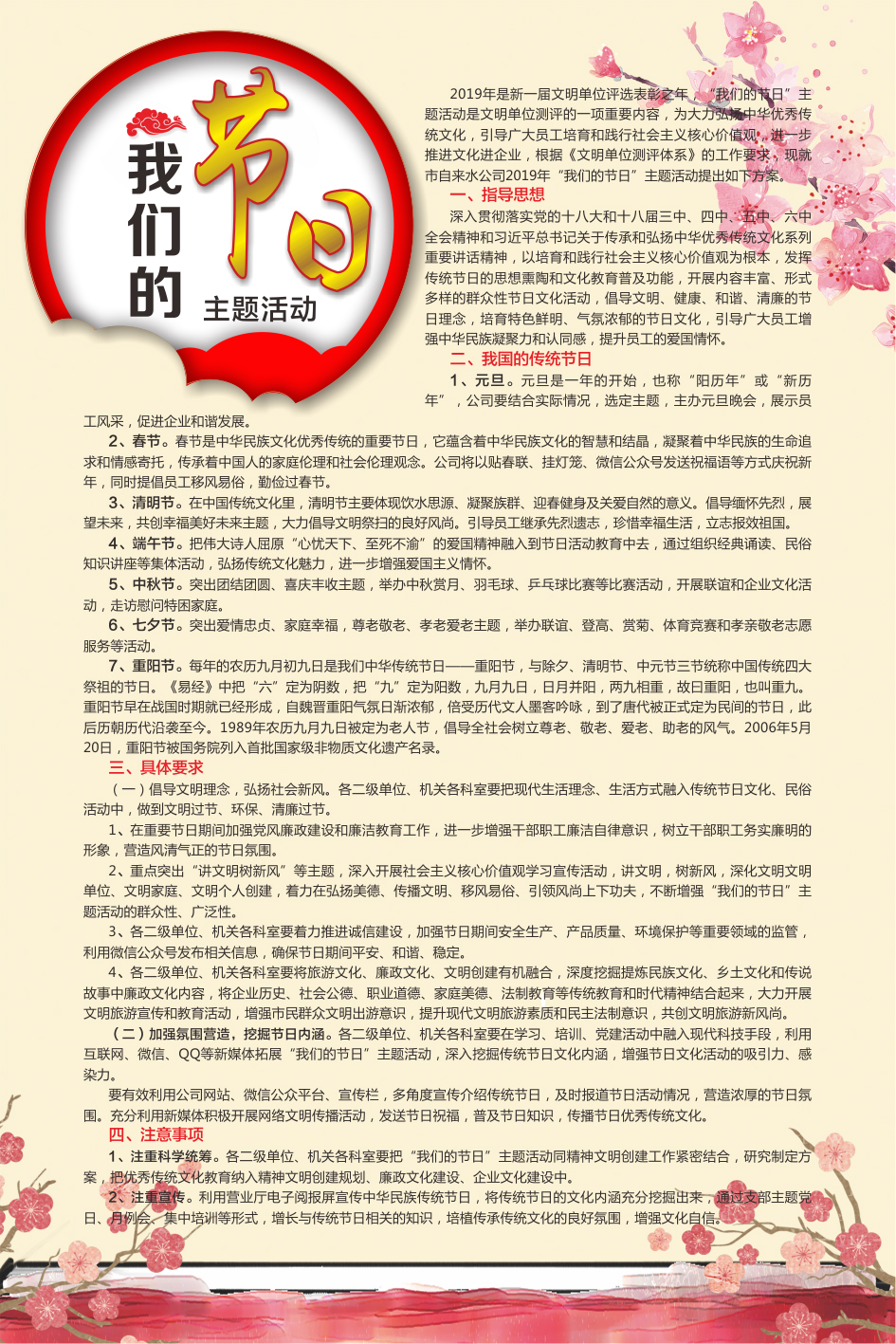 2019年是新一届文明单位评选表彰之年,“我们的节日”主题活动是文明单位测评的一项重要内容,为大力弘扬中华优秀传统文化,引导广大员工培育和践行社会主义核心价值观,进一步推进文化进企业,根据《文明单位测评体系》的工作要求,现就市自来水公司2019年“我们的节日”主题活动提出如下方案。