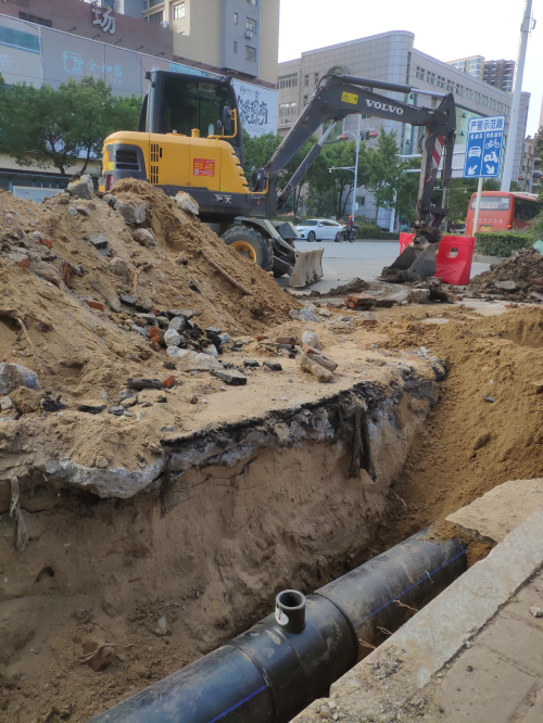 最后我们来到了槐荫大道与北京路交接处,由于槐荫大道全线施工改造,位于北京路交接处的供水管道需要向外迁移,现场挖掘机,热熔机一齐开动,各部门通力合作,密切配合,各司其职,各负其责,一节一节地推进,把工作做实做细。