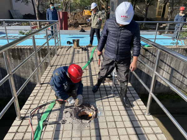 11月10日,在三水厂一期回收水池上,几名机修工正在进行切割拆除工作,完成原有旧设备拆除后,他们将进行回收水池搅拌系统升级改造。